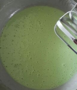 -แบ่งน้ำกะทิไว้สองช ามช ามแรกผสมกลิ่นมะลิลงไปให้เข้ากัน และอีกหนึ่งช ามใส่น้ำใบเตยลงไปผสมให้เข้ากัน