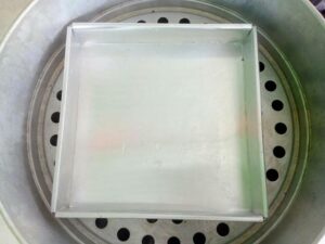 -เตรียมถาดสำหรับขนมชั้นใส่น้ำในลังถึงจนเ ดื อ ดแล้วนำถาดลงไปนึ่งวอร์มก่อน 15 นาที