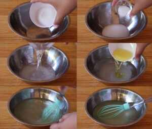 -เทน้ำผสม ใส่เกลือ,น้ำตาล,เบกกิ้งโซดา,แอมโมเนีย,น้ำมั นพื ช คนให้เข้ากัน