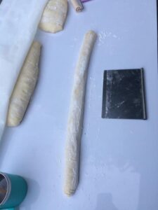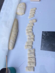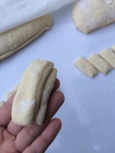 ส่วนระหว่างการตั ดถ้าแป้งติดมือ เราก็ใช้แป้งสาสีที่เรานำมานวดเป็นแป้งนวลกันติดมือค่ะ