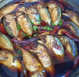 นำป ล าทูลงเรียงให้สวยงาม ต้มน้ำให้เ ดื อ ดปรุงรสด้วยน้ำตาล เกลือ ใส่ซีอิ๊วดำใส่กระเทียมร ากผักชีพริกไทย