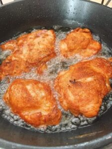 ตั้งกระทะใส่น้ำมั น ให้ร้ อ นจึงใส่ไก่ลงทอด จนสุ กเหลืองทั้งสองด้าน