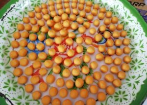 จะใช้เวลาทอดประมาณ 3-5 นาที เมื่อแป้ง เริ่มฟูลอยขึ้นเล็กน้อย ใช้หลังตะแกรงโปร่งๆ กดแป้งให้พองฟู
