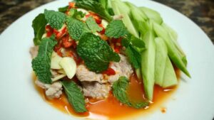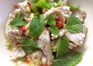 ชิมรสตามชอบ ราดลงบนหมูที่เตรียมไว้ โ ร ยด้วยกระเที ย มฝ าน ใบสะระแหน่ และพริกแห้งทอดกรอบ พร้อมรับประทาน