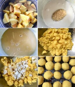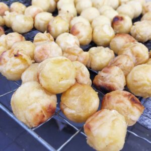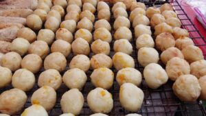 -นำส่วนผสมมันกับส่วนผสมเ ผื อก มาปั้นเป็นก้อนกลม โดยปั้นให้แน่น จากนั้นนำไปปิ้ งไ ฟ อ่อน ๆ