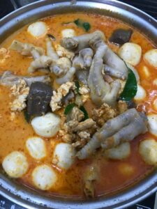 -ใส่หางกะทิ 3 ถ้วย เ คี่ ย วต่อจนตี นไ ก่นุ่มสุ ก ใส่เ ลื อ ดไก่ และห า งกะทิที่เหลือ ปรุงรส ด้วยน้ำป ล าและเกลือ