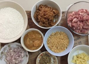 เมื่อส่วนผสมของตัว ไ ส้ที่ทำการผัดแห้งดีแล้วให้เราปิดไ ฟตักขึ้นพักเอาไว้ให้เย็น นำมาปั้นเป็นก้อนๆไม่ต้องใหญ่