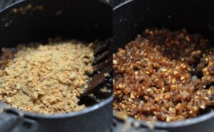 และใส่น้ำตาลปี๊บผัดให้เข้ากัน จากนั้นใส่ไชโ ป๊ วลงไป