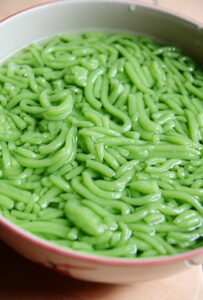 -กวนจนแป้งได้ที่ กดใส่พิมพ์ให้ตัวแป้งลงในน้ำเย็นที่เตรียมไว้