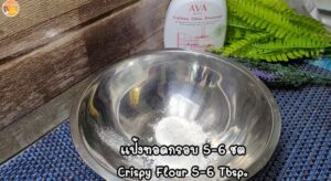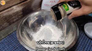 1. ผสมแป้งทอดกรอบกับพริกไทย ซีอิ๊วขาว น้ำปูนใสใส่น้ำแข็งทำให้แป้งกรอบนาน