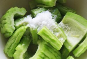 ซ อ ยมะระบางๆ แล้วนำไปค ลุ กกับเกลือจนเ นื้ อ มะระมีความนุ่ม หรือจะใช้วิธีนำไปแช่ในน้ำเกลือสักพัก