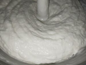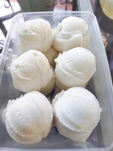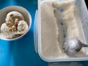 -แต่ถ้าอย ากให้ไอติมกะทิเนียน นุ่ม เราก็เลยนำไอติมออกจากภาชนะ นำไปปั่นในเครื่องปั่นจนเนียนดี