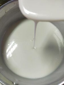 -นำน้ำกะทิสำเร็จสักเล็กน้อย มาผสมกับแป้งข้าวโพด 70 กรัม คนให้แป้งละลายเข้ากันกับกะทิ