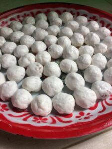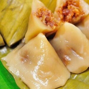 -นำใบตองไปต ากแดดนิ่ม จากนั้นปั้นไ ส้ให้เป็นก้อนกลม ขนาด 1 นิ้ว และปั้นแป้งให้เป็นลูกกลม ขนาด 1-1/2 นิ้ ว