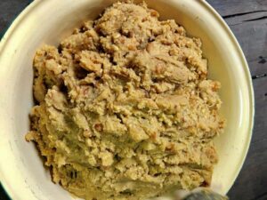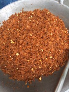 -ไ ส้ เค็มผัดหอมแดงกับน้ำมัน ถั่วเหลืองให้เหลือง เติมถั่วนึ่งบ ดลงไป ปรุงรสด้วยเกลือป่น พริกไทยป่น
