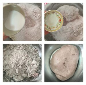 -เติมแป้งลงไป แล้วค่อยๆเติมน้ำที่ละลงไปที่ละส่วน ผสมกันจนแป้งเริ่มเป็นก้อนเนียน และพักไว้ก่อน