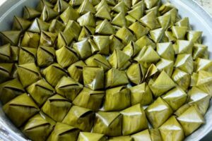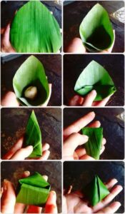 -นำใบตองใบเล็กซ้อนใบใหญ่ (ให้ด้านหลังใบตองช นกัน) จากนั้นม้วนให้เป็นก ร วย นำขนมวางในก ร วย และริมใบตองทั้ง 4 ด้าน