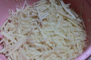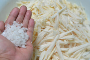 -ใส่เกลือป่นลงไปบนหน่อไม้ ค ลุ กจนเข้ากันดี นำไปตากแดดประมาณ 2-3 ชั่วโมง ช่วงนี้เกลือจะดึ งน้ำออกจากหน่อไม้ จะทำให้หน่อไม้นิ่ม