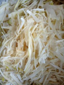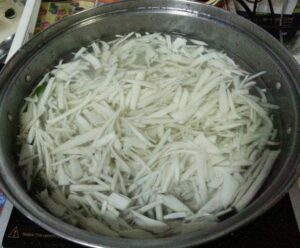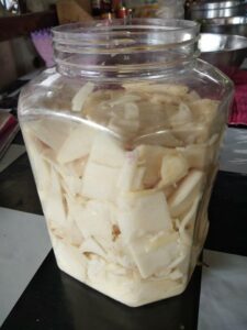 -ใส่เกลือละลายกับน้ำเปล่า ใส่หน่อไม้ลงไปหมักประมาณ 1 คืน เทน้ำเกลือออก