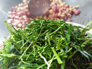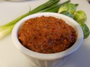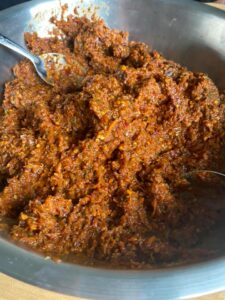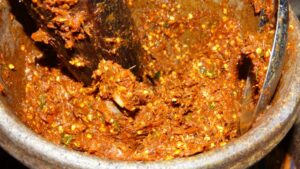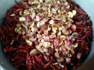 -นำพริกไปคั่ วให้สุ กและห อ มใส่เกลือไปด้วยนิดหนึ่งนะคะครึ่งช้อนช า พอพริกแห้งสุ กก็ให้นำมาตำให้ละเอียดแล้วก็พักไว้