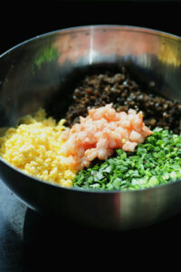 -ขั้นตอนต่อไป คือ ทำแป้งเกี๊ยว ให้เตรียมถ้วยไว้ใส่ส่วนผสมของแป้ง และน้ำลงไป หลังจากนั้นให้ผสมกันจนขึ้นรูป