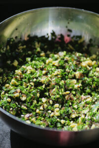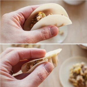 -นำแผ่นเกี๊ยววางไว้กับมือ จากนั้นตักช้อนใส่ไ ส้ ที่เตรียมไว้ตรงกลาง พั บมาท บกันแล้วบี บขอบรอบๆ ให้เรียบร้อย