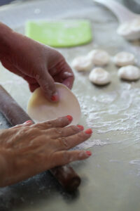 -ม้วนให้เป็นก้อนกลมๆ พักไว้สักสองสามนาที แล้วจึงกดให้แบน ตามด้วยค ลึ งจนกลายเป็นแผ่นกลม