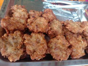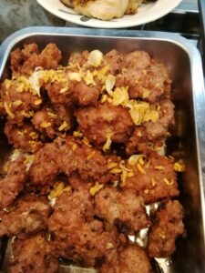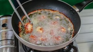 -ตั้งกระทะเปิดไ ฟ ปานกลางใส่น้ำมันรอให้ร้ อ นแล้วปั้นหมูให้ได้ชิ้ นพอดีคำลงไปทอด