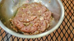 -นำหมูสั บ ใส่ลงในภาชนะสำหรับผสม ต อ กไข่ไก่ไป ตามด้วยสามเกลอ ผงปรุงรส ซอสปรุงรส และน้ำตาลทราย