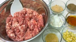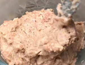 -จากนั้นเอามือนวดหมูกับส่วนผสมให้เข้ากัน นวดขย่ำไปเรื่อยๆประมาณ20-30 นาที ได้ที่แล้วเอาเข้าแช่ช่องฟริซอีก 20 นาที