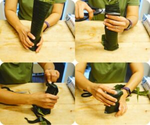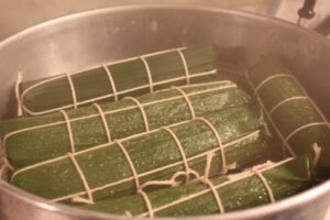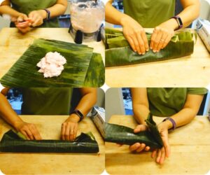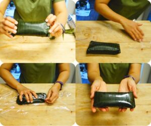 -ทำให้ห่อเป็นทรงกลม ๆ แล้วพับปลายด้านหนึ่งก่อน จับตั้งขึ้นและเ ข ย่ าให้ส่วนผสมแน่น ๆ แล้วก็ตัด ส่วนใบตองที่เกินออกไป