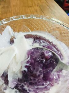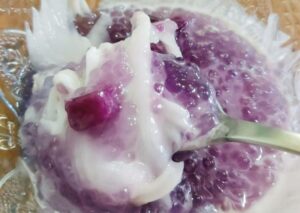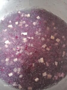 -ทำความสะอาดสาคู รอให้สะเ ด็ ดน้ำแล้วเทใส่ในน้ำอัญชันที่เตรียมไว้ ต้ ม และคนไปเรื่อยๆ