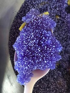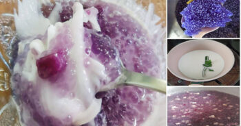 -แล้วหยดน้ำมะนาวใส่ลงไป 3 หยด เพื่อทำให้น้ำสีน้ำเงินเข้ม กลายเป็นสีม่วง