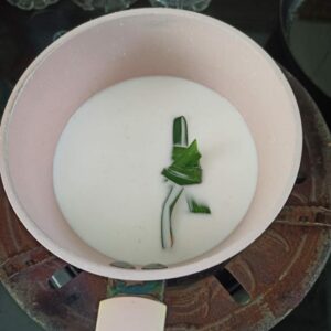 -ให้ตั้งน้ำเปล่า 1 ลิตร + ใส่ใบเตย ใส่น้ำอัญชันลงไป รอจนเดื อ ด