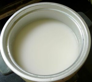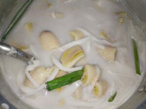 -ตั้งน้ำกะทิใช้ไ ฟ ปานกลางค่อนไปอ่อน ใส่น้ำตาลปี๊บ น้ำตาลทราย เกลือ และใบเตย ลงไป