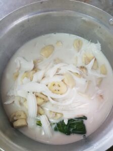 -ใส่กล้วยที่นึ่งไว้ตามด้วยมะพร้าวอ่อน