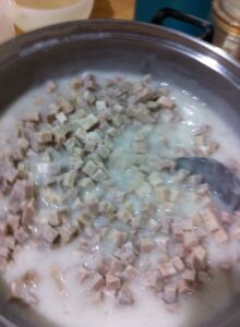 -นำทุกอย่ างลงในหม้อแล้วคนให้เข้ากันจนละลายจากนั้นนำขึ้นตั้งไ ฟ คนจนกะทิข้นแล้วยกลง