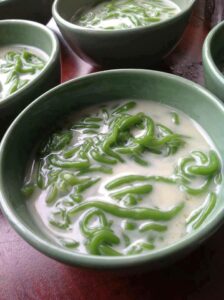 -แช่เส้นลอดช่องทิ้งไว้ใน น้ำเย็น 5-7 นาทีแล้วจึงช้อนขึ้นพักไว้ให้สะเด็ดน้ำ