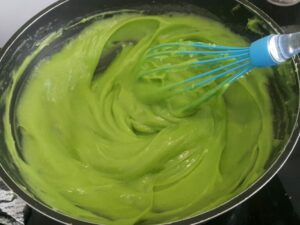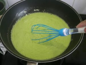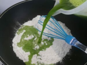 -คนผสมให้แป้งละลายเข้ากับน้ำปูนใสใบเตยจนหมดเม็ดแป้ง