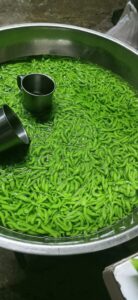-นำน้ำแข็งเติมใส่ในกะละมัง จนน้ำเย็นจัด รีบตักแป้งใส่ในกระบอกบี บเส้น บี บเว้นจังหวะ
