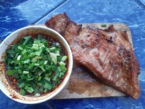 -หมักค อหมูด้วย 3 เกลอ ซอสห อ ยน างรม ซีอิ้วขาว ซีอิ้วดำหวาน น้ำตาลนิดหน่อย ผงปรุงรสนิดนึ่ง หมักไว้ในตู้เย็นประมาณ 3-4 ชั่วโมง