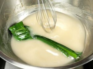 -เตรียมกะทิ โดย เอาหัวกะทิไปต้ม ผสมน้ำตาลและเกลือ ผสมให้ส่วนผสมละลายเข้ากัน จากนั้นพักไว้ก่อน