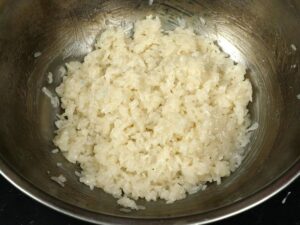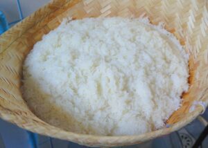 -นำข้าวเหนียวไปนึ่ง ให้สุ ก การนึ่งข้าวเหนียวต้องนึ่งให้พอดีไม่สุ กเกินไปเพราะจำทำให้ข้าวเหนียวมูนไม่เป็นเม็ด