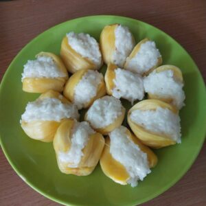 -นำข้าวเหนียวมูนยั ดใส่ขนุนแทนที่เม็ดขนุน จากนั้นจัดเรียงใส่จานให้สวยงาม ราดด้วยน้ำกะทิ