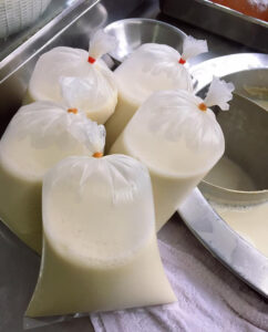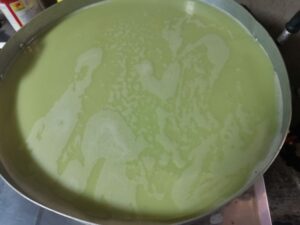 เหลืองจนหมด นำน้ำเต้าหู้ที่ได้จากการกรองครั้งแรก นำไปกรองโดยขาวบางอีกที