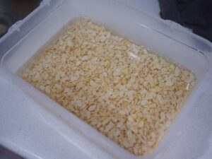 -แช่ถั่วเหลืองไว้ประมาณ 6 ชั่วโมง หลังจากนั้นกรองถั่วเหลืองด้วยตะกร้าพล าสติกขนาดเล็กเพื่อให้สะเด็ดน้ำ