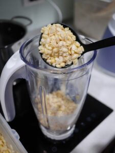 -นำถั่วเหลืองปั่ นด้วยเครื่องปั่ น เวลาปั่ นให้ใส่ถั่วเหลืองประมาณครึ่งโถก็พอ แล้วใส่น้ำสะอาดที่เตรียมไว้โดยใส่พอท่ ว มเม็ดถั่ว