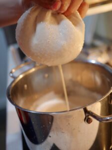 -หลังจากนั้นนำไปใส่ในหม้อ หรือกะละมังที่เตรียมไว้โดยใช้ผ้าขาวบางกรองก ากถั่วเหลือง พอเราปั่ นถั่วเหลือง