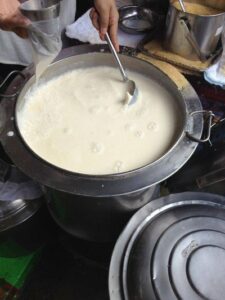 -ปั่ น ถั่วละเอียดแล้วก็เอามากรอง กรองออกมาจะได้น้ำน ม ฟองๆ ช้อนฟองออกเรื่อยๆ( ถั่วครึ่งโล น้ำ 4 ลิ ตร แบ่ง ปั่ น ทั้งหมด 6 รอบ)
