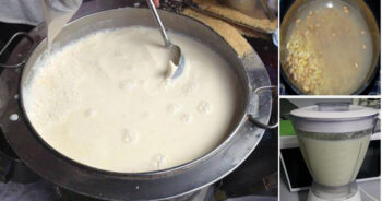 -พอน้ำเต้าหู้เดื อ ด ห รี่ไ ฟลงใส่น้ำตาล (หากทำขายยังไม่ต้องใส่น้ำตาล) ใส่เกลือป่น แล้วเพิ่มไ ฟ ให้แ ร งอีกครั้ง